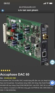 Luxman DA250 nó mắc hơn do là nguyên cái máy, còn accuphase Dac 50/ 60 chỉ là cái board card mà giá như vậy đâu phải rẻ Bác. Do đó em mới so với luxman DA 250, chứ so với mấy em hạng thấp mà nó dỡ hơn thì thôi rồi ai dám mua.