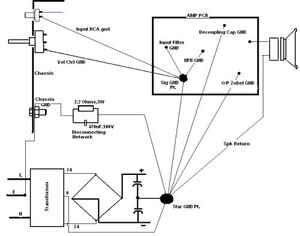 Mình đoán là bạn chưa đi dây đúng nguyên tắc của mass, như mình đã lắp rất nhiều mạch Amp. chung nguồn thì không có ù xì gì (chưa cấp tín hiệu, vặn Max Vol., áp tai vào loa, bật và tắt Amp. không thấy khác nhau gì hết, tạm gọi là im phăng phắc). Xin chia sẻ với bạn mình đã áp dụng như thế này: 1. Các điểm mass thông nhau nhưng không giống nhau, mà mỗi điểm mass khác nhau về dòng điện chạy qua nó. 2. Tưởng tượng dòng điện như dòng nước, như dòng sông đổ ra biển, điểm có dòng chảy mạnh bố trí cho nó đi nhanh nhất và đổ về nguồn sớm nhất (độ ưu tiên giảm dần cho điểm có dòng chảy nhỏ dần). Đừng để nó chảy qua điểm có dòng nhỏ hơn nó (vd như mass loa cho đổ về chân tụ lọc nguồn luôn chứ đừng câu lên mạch rồi quay lại). Các mạch mua sẵn thường chưa tách được mass, cần thiết phải cắt mạch mass ra cho đi lại về nguồn theo nguyên tắc này. 3. Tách các điểm Mass hai kênh, chỉ gặp nhau ở điểm mass cuối cùng là chân mass tụ lọc nguồn, tránh bớt crosstalk. 4. Bố trí các mạch khuếch đại tín hiệu nhỏ xa các nguồn nhiễu như biến thế, mạch nguồn, mạch động lực, cọc loa..., cầu kỳ và có điều kiện hơn thì tách power ra thành module riêng. 5. Áp dụng thêm mạch tách nguồn cho 2 kênh, lọc nhiễu các loại (EMI, đầu audio vào ra, phản hồi âm, bọc chống nhiễu...) nếu thấy cần thiết. ...
