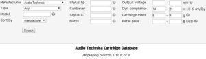 PDF khá chi tiết của SL-1600Mk2 ở đây. Bắt đầu Online tìm cartridge... Từ hướng dẫn của SL-1600Mk2 thấy cần của SL-1600Mk2 thuộc loại low-mass (12g) và khuyến cáo nên dùng cartridge trong vùng 5 g đến 9g. Sử dụng bảng trợ giúp tìm được thông số C trong khoảng 14 đến 21. Nhập các thông số về m và C, chưa quan tâm đến các tùy chọn khác thì được khoảng gần 400 loại Nhưng mà chỉ thích dùng mỗi Audio Technica thôi nên thêm tùy chọn nữa thì được 8 loại: AT 10/ 10G/ 110E/ 140LC/ 155LC/ 22/ 420E OCC/ OC9III. ...
