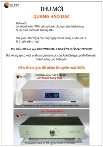 Chào các bác! DAC do quanghao phát triển lần đầu tiên được giới thiệu và tham gia : TRIỂN LÃM COMPUTER AUDIO (LẦN THỨ I TẠI HÀ NỘI). Quanghao trân trọng mời các bác đến tham gia và ghé tham sp quanghao tại Triển lãm. Thời gian: 9h-19h ngày 20-21/6/2015 Địa điểm: C4, Làng Quốc tế Thăng Long, phố Chùa Hà, quận Cầu Giấy, Hà Nội - Đăng ký và nhận vé mời trực tiếp tại: viewtopic.php?f=26&p=2293671#p2293671 - Liên hệ nhận vé tại : Số 6/18 Huỳnh Thúc Kháng - Đống Đa- Hà Nội. Nguyễn Xuân Hùng ĐT: 0936.372.886 Cảm ơn các bác đã quan tâm và sự hiện diện của các bác là niềm vinh dự cho một sp Hi-end Việt Nam Trân trọng Quanghao