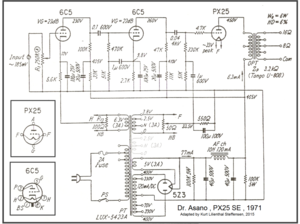Marantz 8B một thời được săn tìm và đến giờ giá vẫn ngất ngưởng. http://www.ebay.com/itm/Marantz-8B-Tube ... SwHJhXMkhb Tube công suất EL34 PP. Phần nguồn dùng bội áp có vẻ không Hiend lắm. Những năm 60 thường ưa chuộng mở đầu dùng bóng 5 cực để có âm thanh nhanh hơn, gần với bán dẫn. Nối tầng trực tiếp sang đảo phase kiêm Driver dùng Tube 3 cực để âm thanh mềm hơn, trở kháng lái thấp hơn. Tầng công suất chạy chế độ UL và Fix bias với hồi tiếp nội bộ bằng trở 68R và Bypass tần số cao.