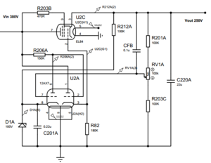 Mạch Regu sử dụng Tube EL84 và 12AX7. Có thể chạy đến 80mA dùng rất tốt cho Pre âm thanh hay hơn nắn choke nhiều. Dựa trên mạch của bác QuyetDIY post em chỉnh lại một chút, test thử ngon hơn rất nhiều. Các điều chỉnh: - 12AX7 không đấu // 2 nửa mà tách ra thành 2 nhiệm vụ riêng biệt. Nửa đầu làm nhiệm vụ khuếch đại điện áp biến đổi đầu ra lên cỡ 30 lần. Nửa 2 nối tầng trực tiếp, có nhiệm vụ Driver EL84 với mạch CF đảm bảo tín hiệu điều khiển đủ mạnh. - Bổ sung tụ hồi tiếp CFB 0.1uF đưa tín hiệu hồi tiếp âm vào lưới 12AX7. Mạch phản ứng nhanh hơn với những biến đổi của tải. Điện áp ra phẳng hơn.