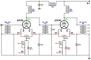 Bên topic GM70 và trên google có nhiều schematic mà bác . Nhân tiện đây gửi bác thông số OPT của GM70 do người Nga thiết kế ( nhờ google dịch ) . Транс № 27 для ГМ70. Железо от ОСМ-0,4 – ШЛ40 х 50 – 32. Ra = 8,05 ком. Rн = 8 ом. Первичка: 3840 витков провода ПЭТВ-2 диаметром 0,355 мм в 3+6+6+6+3 слоях по 160 витков в слое. Активное сопротивление первички – 183 ома. Вторичка: 124 витка, провод ПЭВ-2 диаметром 0,47 мм, в четырёх секциях 4+4+4+4 слоёв в параллель. Активное сопротивление вторички – 0,2 ома, приведённое – 192 ома. Изоляция межслойная – бумага 0,02 мм, межсекционная – бумага+фторопласт, общей толщиной 0,25 мм. КПД – 95,3%.