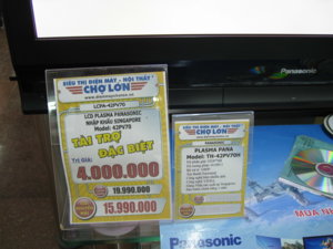 Re: Panasonic TX-37LX800 ,TX-37LZ80 và Panasonic TH-42PV80H Chào các bác, Panasonic 42PV80H tại Siêu Thị Chợ Lớn quê em (Qui Nhơn) vẫn niêm yết giá trên trời :evil: Có điều em không thể hiểu được là vì sao 42PV70H giá lại cao hơn 42PV80H hở các bác? Về hình thức bên ngoài thì viền quanh của PV70H là bóng mờ, còn của PV80H lag bóng láng. Các bác xem ảnh: